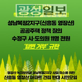 성남소재 영장산 녹지보전과 성남복정2지구 사업취소를 위한 신흥동 영장산 아파트 건립반대 시민모임(이하 시민모임)은 성남시 수정구 시·도의원 11명(더불어민주당 7명, 미래통합당 4명)에게 성남복정2지구 공공주택 사업의 찬, 반을 물었다.