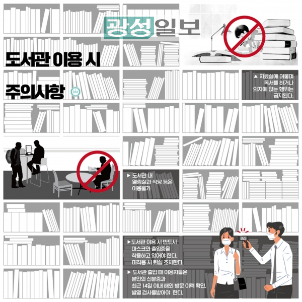 도서관 출입 때 이용자들은 신분증과 최근 14일 이내 해외 방문 이력 확인 절차, 발열 검사를 받아야 한다.이용 땐 반드시 마스크와 출입증을 착용하고 있어야 한다. 미착용 시 퇴실 조치한다.