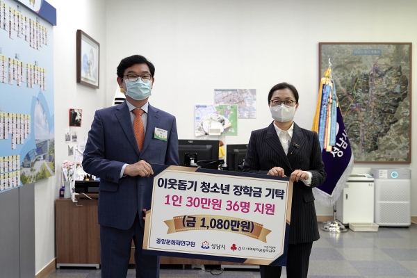 성남시에 재단법인 중앙문화재연구원이 5월 29일 성남시에 1080만원의 장학기금을 맡겼다.시는 이날 오후 2시 시장 집무실에서 은수미 성남시장과 조상기 중앙문화재연구원장 등이 참석한 가운데 ‘청소년 장학금 전달식’을 했다.