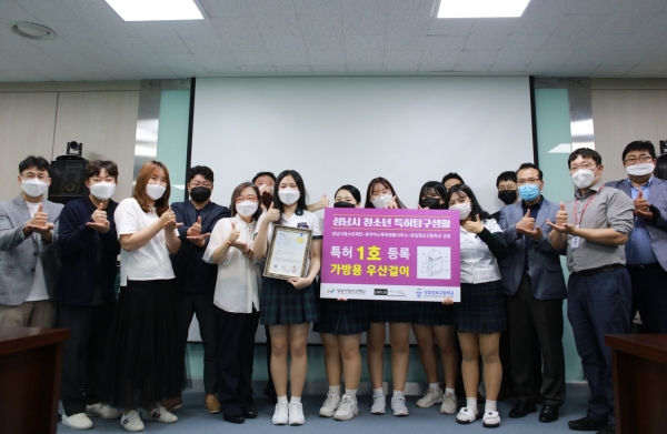 ‘가방용 우산걸이’는 2018년 진행된 성남시청소년재단 제1회 청소년 특허 탐구생활에서 1등을 차지한 성일정보고 한희수 외 4명의 청소년이 개발하고 2020년 5월 15일 특허등록이 확정되어 3년간의 대장정이 결실을 맺은 것이다. 학생들의 아이디어 발굴부터 선정심사, 특허․등록까지, 성남 지역기업 큐리어스특허법률사무소(대표변리사 박현호)의 재능 기부에 의해 진행됐다.