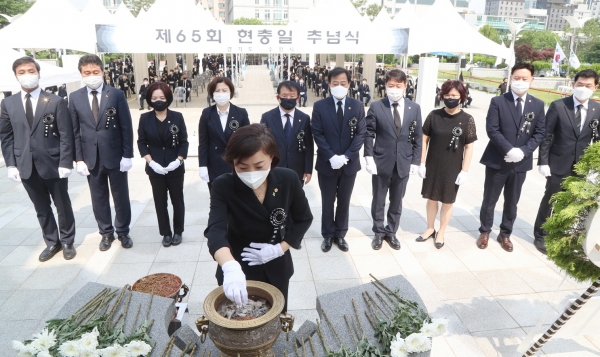 경기도의회 안혜영 부의장(더불어민주당, 수원11)은 6일(토) ‘제65회 현충일’을 맞아 수원시 현충탑을 참배했다.안 부의장은 “현충일은 한국전쟁 당시 국가를 위해 목숨을 바친 순국선열과 호국영령의 숭고한 희생을 추모하는 국가 추념일이다.”라며, “경기도의회는 1,370만 도민과 함께, 국가를 위한 희생에 보답하는 대한민국, 평화와 번영의 시대를 선도하는 경기도를 만들어가겠다.”고 밝혔다.