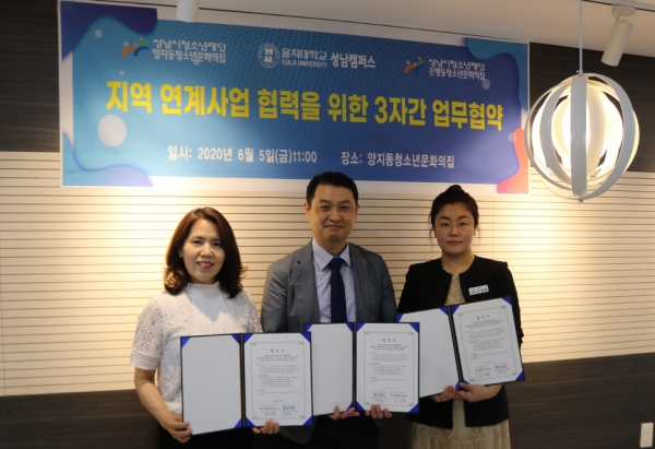 성남시청소년재단(대표이사 진미석) 양지동청소년문화의집·은행동청소년문화의집은 지난 6월 5일 을지대학교 성남캠퍼스 한마음봉사단(단장 김명철)과 청소년 복지 보호·활동 사업의 활성화 및 지역 속 청소년 성장을 이끌어 내기 위한 3자간 업무협약을 체결하였다.