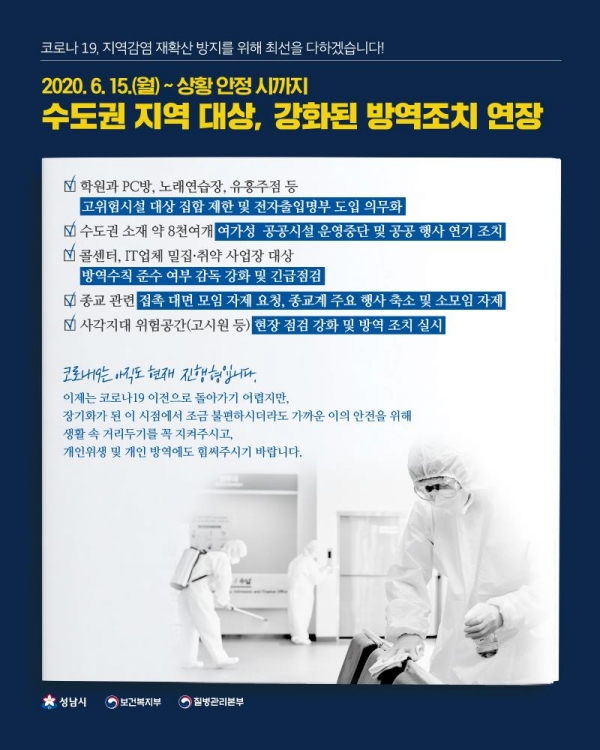 다만, 대상 업체 특성상 일상생활에서 차지하는 비중이 큰 만큼 전면적인 집합금지가 아닌 방역수칙의 철저한 준수가 주 목적이며 사업장 자체 노력 외에도 이용객의 협조가 매우 중요하다고 도는 설명했다.