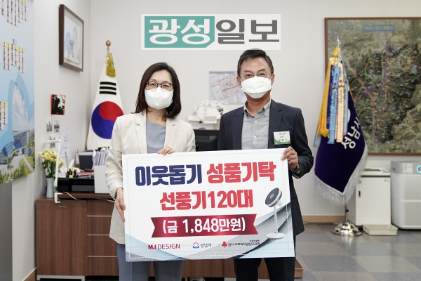 성남시는 이날 오전 11시 시장 집무실에서 은수미 성남시장과 문준기 ㈜엠아이디자인 대표 등이 참석한 가운데 ‘이웃돕기 성품 기탁식’을 했다.기증한 선풍기는 가정용 스탠드형(개당 15만4000원)이다.
