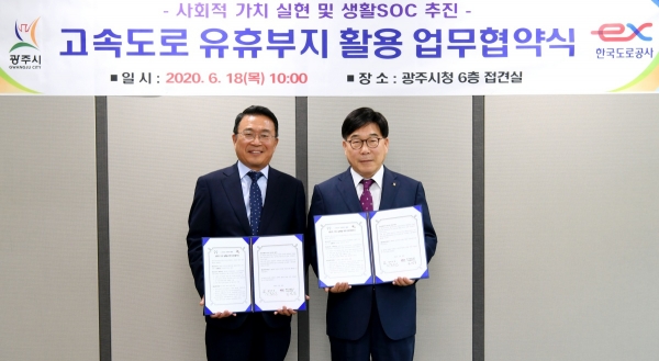 광주시는 18일 시청 접견실에서 한국도로공사 수도권본부와 고속도로 유휴부지 활용에 대한 업무협약을 체결했다.이날 협약은 시에서 생활SOC 등 각종 공익사업을 추진하고 한국도로공사 수도권본부는 고속도로 주변 유휴 부지를 발굴해 해당 사업부지로 무상 제공하는 내용을 담고 있다.