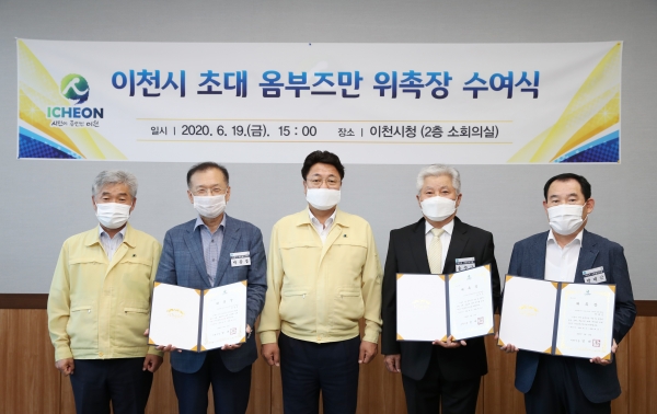 이천시(시장 엄태준)는 19일 시청 2층 소회의실에서 각 분야의 전문가로 구성된 시민옴부즈만 3명을 위촉했다.이날 위촉장을 받은 시민옴부즈만은 송수근 전 한국관광대교수, 박종풍 전 감사원 부이사관, 박대근 전 국민권익위원회 서기관으로, 공정하고 독립적으로 옴부즈만을 수행할 수 있는 점을 높이 평가받아 수많은 지원자 중 선발되었다.