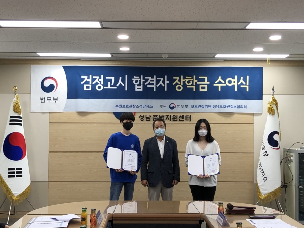 법무부 성남보호관찰소(소장 정성수)는 2020. 6. 19.(금) 16:00 성남시청 4층 성남보호관찰소 회의실에서 검정고시에 합격한 보호관찰청소년들을 격려하고, 더 큰 목표에 도전할 수 있도록 ‘검정고시 합격자 장학금 수여식’을 개최하였다.