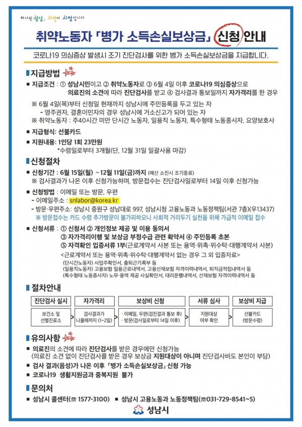 성남시는 일용직 등 취약 노동자들이 코로나19 검사를 생계 걱정 없이 받을 수 있도록 23만원의 병가 소득손실보상금을 지급한다.지원 대상은 성남에 사는 주 40시간 미만 단시간 노동자, 일용직 노동자, 특수형태 노동 종사자, 요양보호사 등이다.
