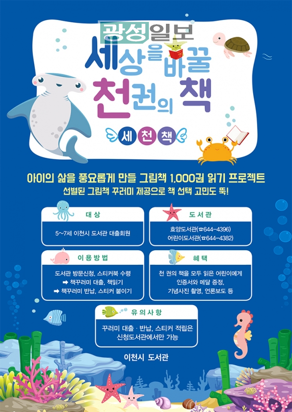 아이에게 매일 1권씩 책을 읽어주면 3년이면 1,095권이 된다. 매일 3권씩 읽어준다면 1년 안에 1,000권을 달성할 수 있다. 먼저 사업을 운영하고 있는 효양도서관에서는 시작한지 1년이 채 되지 않아서 세천책 5호 달성자까지 나올 정도로 큰 인기를 얻고 있다. 세천책 프로젝트를 통해 유아가 책 읽기의 즐거움을 느끼고, 평생독서습관을 형성하는 데 도움이 되기를 기대한다.어린이도서관 세천책 운영과 관련한 기타 문의사항은 이천시통합도서관 홈페이지(www.icheonlib.go.kr)에서 확인 또는 어린이도서관(031-644-4382)으로 문의하면 된다.