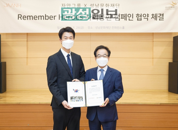 성남문화재단(대표이사 노재천)이 글로벌 패션 모바일 플랫폼 기업 자안그룹(대표이사 안시찬)과 독립유공자 후손을 위한 ‘Remember Heroes’ 사회공헌 캠페인 진행을 위한 업무협약을 체결했다.2011년 설립한 자안그룹은 글로벌 탑 브랜드를 운영하고, 신생 브랜드들의 성장을 이끌어 온 패션&화장품 브랜드 전문 기업이다.