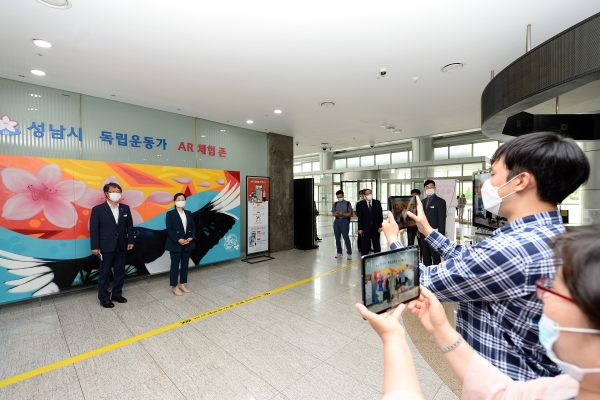 이 날 은 시장은 성남시청 1층 누리홀을 찾아 스마트도시과장으로부터 사업 추진의 경과에 대해 보고받고, 성남시AR 앱을 통해 독립운동가와 사진과 동영상을 촬영하기도 하며 독립운동가들과 만났다. 은 시장은 “시민들이 이렇게 쉽게 독립운동가와 만나고 소통할 수 있게 되어 기쁘다. 더 많은 독립운동가를 콘텐츠로 구현해 시민들에게 역사,문화적 가치를 알리도록 노력하겠다”라고 밝혔다.