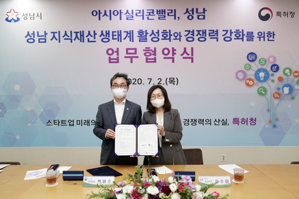 성남시와 특허청이 지역 기업의 특허, 실용신안, 상표, 디자인 등 지식재산(IP) 사업화 지원에 힘을 모으기로 했다.성남시는 7월 2일 오후 2시 시청 2층 회의실에서 은수미 성남시장과 박원주 특허청장 등이 참석한 가운데 ‘성남 지식재산 생태계 활성화와 경쟁력 강화를 위한 업무협약’을 했다.