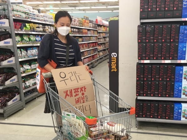 캠페인을 마치고 비닐 플라스틱 포장재로 가득 찬 카트 앞에서 안양군포의왕환경운동연합 노훈심 사무국장은 재포장금지 제도 시행을 촉구하는 내용의 성명서를 낭독했다. 그리고 시민들과 함께 다음의 구호를 외치고 캠페인을 마무리했다.