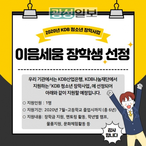 번‘이음세음’장학금은 KDB나눔재단에서 지원하는 청소년 장학사업으로 전국의 취약계층 중학교 1학년 청소년 50명을 대상으로 6년간 진로멘토링, 장학금 지원을 지원하는 사업이다.