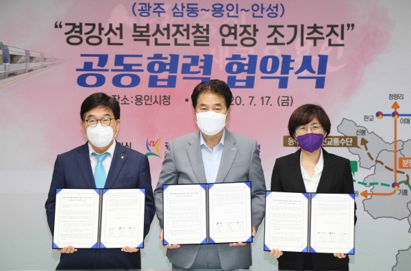 용인시와 광주시, 안성시가 경강선 철도를 광주 삼동역에서 용인, 안성으로 연장건설하는 사업이 조기에 추진될 수 있도록 공동으로 노력하기로 했다.백군기 용인시장과 신동헌 광주시장, 김보라 안성시장은 17일 백군기 시장실에서 ‘경강선 연장 철도건설’ 조기추진을 위해 협력하는 내용의 협약을 체결했다.