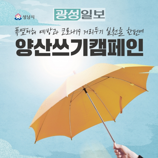성남시는 코로나19 장기화에 따른 폭염 대책의 하나로 ‘범시민 양산, 우산 쓰기 운동’을 편다.양산을 쓰면 체감 온도를 7도 정도 낮춰 폭염 피해를 줄일 수 있고, 코로나19 예방을 위한 거리 두기를 자연스럽게 실천할 수 있어서다.이를 위해 시는 오는 7월 27일부터 9월 29일까지 양·우산 무료 대여 서비스를 편다.