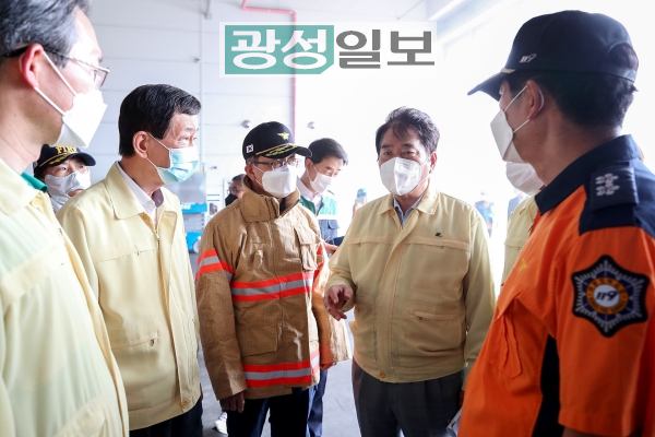 백군기 용인시장은 21일 처인구 양지면 제일리 양지SLC물류센터 화재 현장을 방문해 구조활동을 지원하고 사고 수습에 최선을 다할 것을 당부했다.