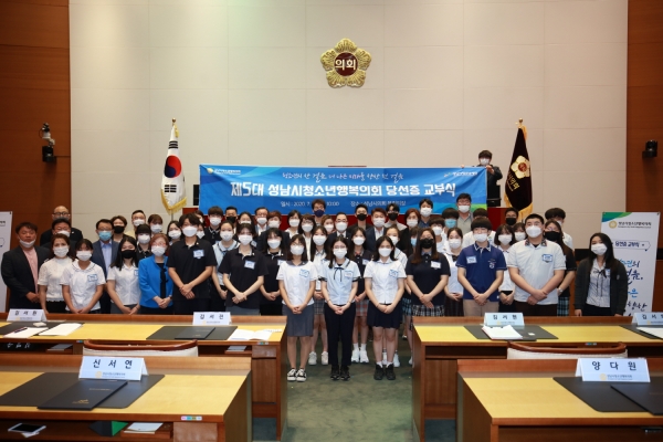 성남시청소년재단(대표이사 진미석)에서는 지난 7월 25일(토) 성남시의회 본회의장에서 『제5대 성남시청소년행복의회』당선증 교부식을 진행하였다.지난 6월 19일부터 7월 8일까지 20일간 제5대 행복의회 청소년 의원 선거에 총 3,208명의 성남시 청소년들이 참여하여 직접 지역의 청소년 대표를 선출하였으며, 면접심사(40%)와 청소년 선거(60%)를 합산하여 35명의 청소년의원이 최종 선출되었다.