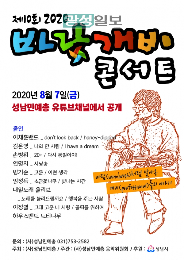 2020 바람개비 콘서트는 오랫동안 지역을 기반으로 음악활동을 이어온 성남민예총 음악위원회의 음악인들이 힘을 모아 성남시민들과 음악을 나누고자 한다. 故 권오원과 같은 노래마을 출신 8집 가수 손병휘, 이채훈밴드의 색소폰연주, 여성중창단 내일노래 올리브, 가수 방기순, 임정득, 김은영의 노래와 성남민예총 문학위원장 연명지 시인의 시 낭송으로 구성되었다. 또한, 출연자들의 반주를 담당하는 하우스 밴드를 운용하여 콘서트의 다채로운 소리를 더욱 풍성하게 전달할 예정이다.