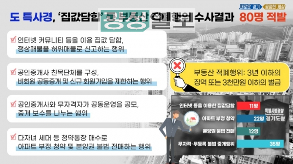 급매로 시세보다 싸게 나온 정상매물을 실거주자들이 담합해 허위매물로 신고하여 정상적인 중개행위를 방해하거나, 자격증이 없는데도 중개행위를 하는 등 부동산거래 질서를 교란시킨 불법행위자 80명이 경기도 수사에 대거 적발됐다.김영수 경기도 공정특별사법경찰단장은 3일 경기도청에서 기자회견을 열고 ‘집값담합 등 부동산 불법행위 수사결과’를 발표했다.