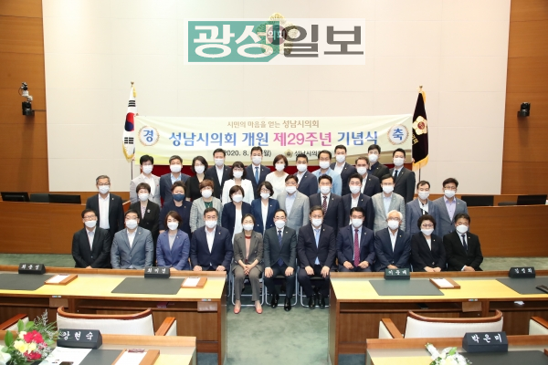 성남시의회(의장 윤창근)는 6일 제256회 임시회 폐회 후 ‘제29주년 개원기념식’을 개최했다.이번 개원기념식은 코로나19의 확산방지를 위해 시의원을 비롯해 은수미 시장, 집행부 간부 공무원 등 최소인원만 참석한 가운데 본회의장에서 간소하게 진행됐다.