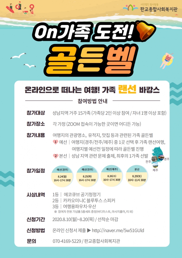 참사람들(이사장 지관근)이 위탁 운영하는 판교종합사회복지관은 지역주민들의 복지증진과 지역사회 발전을 위해 종합적인 복지사업을 시행하고 있는 전문 사회복지기관이다.코로나-19로 인해 여행이 어려운 지역 내 가족들을 대상으로 ‘On가족 도전! 골든벨’을 개최한다.‘On가족 도전! 골든벨’은 온라인으로 떠나는 가족 여름 바캉스를 테마로 한 가족여행 퀴즈대회이다.