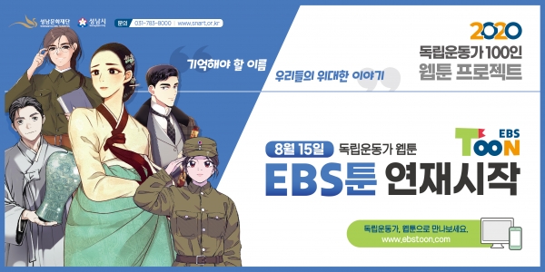 성남문화재단(이사장 은수미, 대표이사 노재천)이 <독립운동가 100인 웹툰 프로젝트>의 2020년 작품을 제75회 광복절인 8월 15일(토)부터 교육용 웹툰 플랫폼 EBS툰을 통해 연재한다.<독립운동가 100인 웹툰 프로젝트>는 3.1운동 및 대한민국 임시정부수립 100주년을 맞아 성남시와 성남문화재단이 지난해부터 3년에 걸쳐 총 100인의 독립운동가들의 삶과 정신을 뉴미디어 콘텐츠인 웹툰으로 그려내는 공공문화 콘텐츠 사업이다.