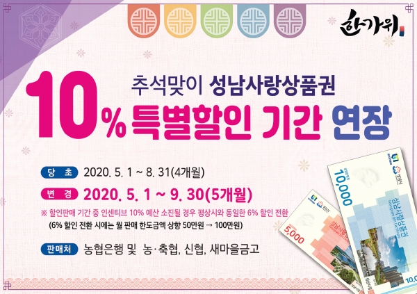 시행했던 성남사랑상품권 10% 특별할인 기간을 당초 8월 31일에서 9월 30일까지 연장한다.