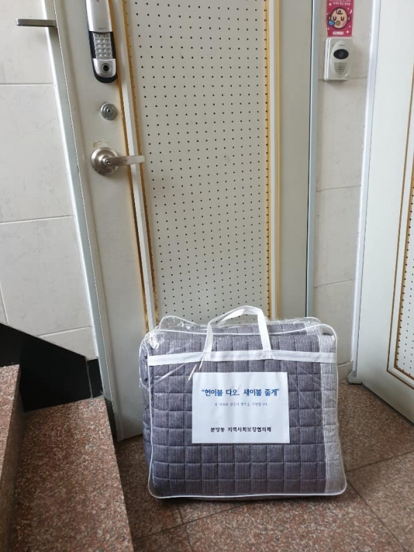 분당동 지역사회보장협의체 유명희 위원장은 “코로나19로 모든 국민이 힘든 시기를 겪고 있지만 경제적, 심리적으로 더욱 어려운 독거어르신들께서 이 어려운 시기를 함께 이겨 나갈 수 있도록 조그마한 기쁨을 드리고 싶다”고 말했다.“헌이불 다오, 새이불 줄게” 사업 2차 및 3차 진행은 27일과 28일에 각각 2세대, 6세대가 예정되어 있고, 사업이 끝난 후 협의체 위원들의 평가회가 이루어질 예정이다.