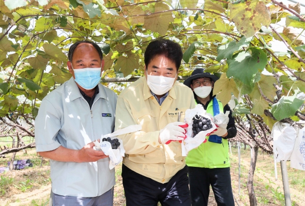 용인시는 26일 NH농협 경기영업본부와 용인시지부 직원 등 24명이 백암면 포도 농가를 방문해 포도 수확을 돕고 수해 농가에 쌀과 포도를 기탁했다고 밝혔다.