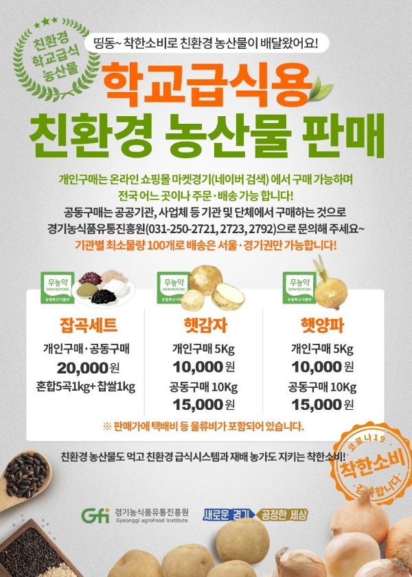 경기농식품유통진흥원(유통진흥원)이 코로나19 영향으로 학교급식이 전면 중단돼 판로가 막힌 학교급식용 친환경 농산물 판매를 위해 다양한 방안을 찾아 실천하고 있다.경기도와 경기농식품유통진흥원은 먼저 지난 19일부터 온라인 쇼핑몰 마켓경기(market.gg.co.kr)에서 잡곡과 햇감자, 햇양파 등 친환경 학교급식 농산물 판매를 시작했다. 잡곡세트(혼합5곡 1kg와 참쌀 1kg)는 2만원, 햇감자와 햇양파는 5kg에 1만원, 공동구매로 사면 10kg에 1만5천원에 구매할 수 있다.