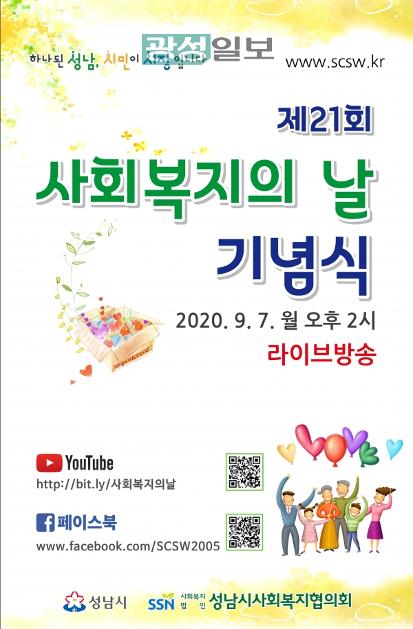 성남시는 오는 9월 7일 오후 2시 온라인으로 ‘제21회 성남시 사회복지의 날 기념식’을 개최한다.성남시가 주최하고, 성남시 사회복지협의회가 주관하여 개최하는 이날 행사는 코로나19 확산으로 사회적 거리두기 2.5단계가 실시되는 등 사회적 분위기를 감안해 사회복지협의회의 페이스북과 유튜브를 통해 생중계하는 방식으로 진행된다.