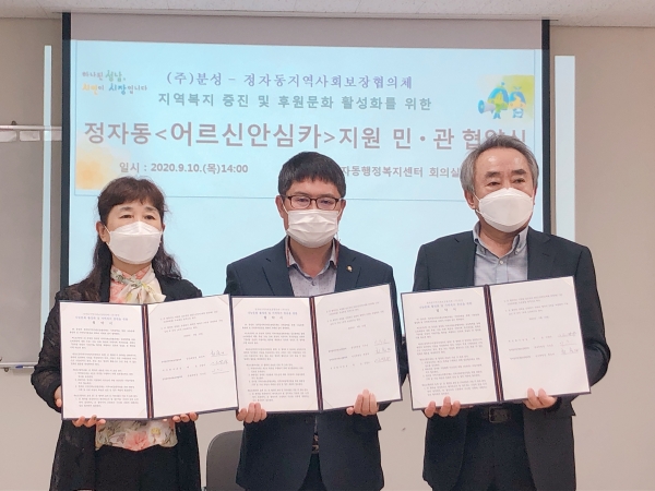 정자동 행정복지센터는 9월 10일 오후 2시 정자동 회의실에서 이수근 정자동장, 신양수 ㈜분성 대표와 최숙자 정자동지역사회보장협의체 위원장 등이 참석한 가운데 ‘정자동 어르신 안심카 지원사업 협약’을 체결하였다.
