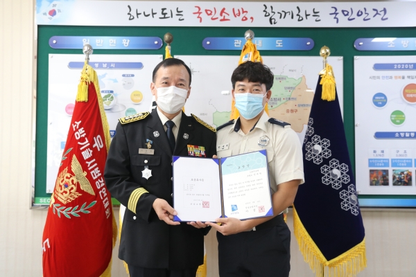 소방활동에 기여한 공을 인정받은 한세혁 소방교에게 소방활동 유공자 표창 수여식을 가졌다.