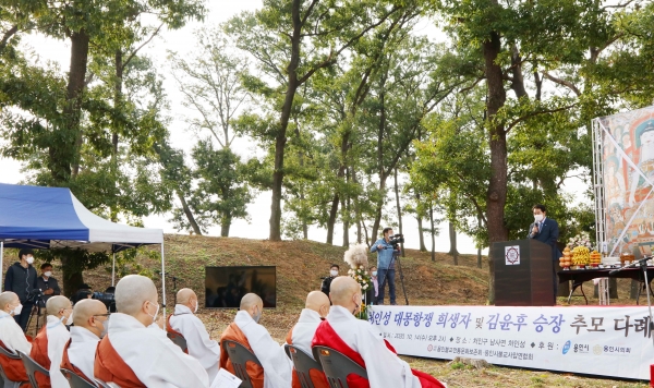 백군기 용인시장은 14일 남사면 아곡리 처인성에서 봉행된 ‘처인승첩 기념 김윤후 승장 추모 다례재’에 참석했다.이 행사는 대몽항쟁에서 처인성 전투를 승리로 이끈 김윤후 승장과 처인 부곡민의 넋을 기리고 추모하기 위해 매년 (사)용인불교전통문화 보존회 주체로 열린다.