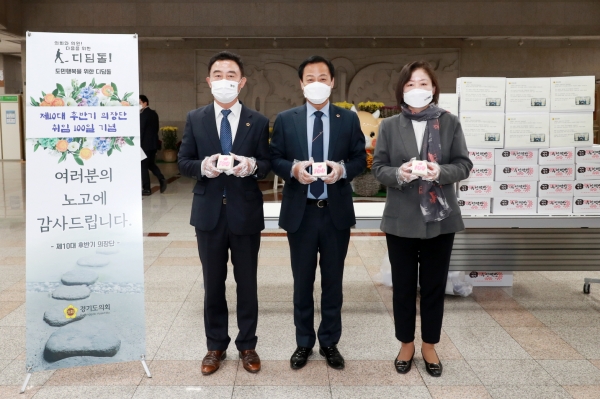 장현국 경기도의회 의장(더민주, 수원7)이 제10대 의회 후반기 의장단 취임 100일을 기념해 의회사무처 직원들에게 ‘백일떡’을 손수 나눠주며 감사와 존중의 마음을 전했다.장현국 의장을 비롯한 진용복(더민주, 용인3)·문경희(더민주, 남양주2) 부의장 등 의장단은 취임 100일을 하루 앞둔 16일 이른 시각부터 1층 로비에서 대기하며 출근하는 직원 한 명 한 명을 반갑게 맞이했다.