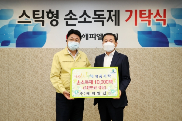 해피엘앤비, 이천시 ‘행복한 동행’에 손소독제 1만팩 기탁 지난 15일 ㈜해피엘앤비(대표 김두상)에서 이천시에 코로나19 예방을 위한 휴대용 손소독제 1만 팩(4천만원 상당)을 기탁해왔다. 기탁한 자사 손소독제는 1회 분량의 손소독제가 스틱형 파우치에 소포장 되어 있는 형태로 휴대성과 위생 면에서 물품을 전달받은 수혜자들에게 유용하게 사용될 것으로 보인다.