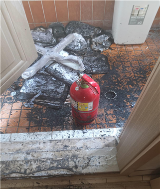 건물 내부에서 화재가 발생했지만 소화기로 초기 진화해 더 큰 인명・재산피해를 막을 수 있었다고 밝혔다.