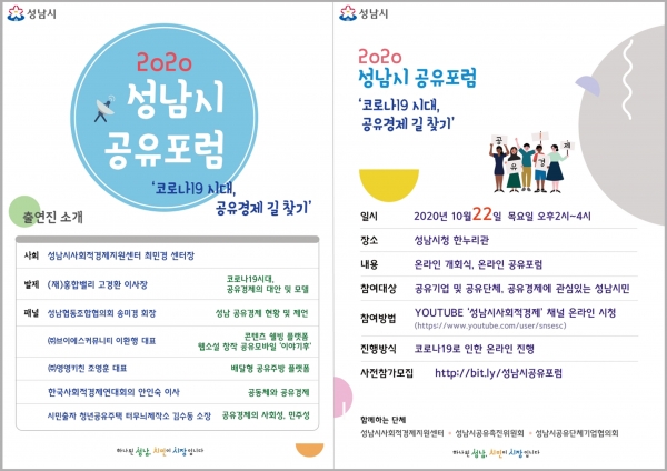 성남시는 코로나19로 위축된 일상생활 속 공유경제 활성화 방안을 모색하기 위해 오는 10월 22일 오후 2시~4시 온라인 포럼을 연다.공유경제는 회의실, 체육시설, 생활 용구, 장난감 등 유휴 자원을 다른 사람과 나눠 활용해 효율을 높이고, 경제적, 사회적 문제를 해결하는 경제모델을 말한다.
