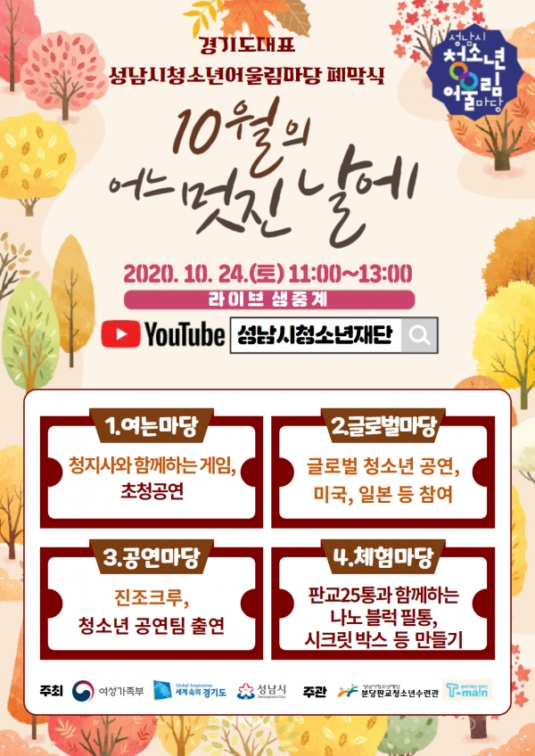 성남시청소년재단(대표이사 진미석) 분당판교청소년수련관은 오는 10월 24일, 오전 11시부터 2020년도 성남시청소년어울림마당 폐막식을 온라인으로 개최한다.‘10월의 어느 멋진 날에’라는 부제로 개최될 이번 축제는 성남시청소년재단 유튜브 채널로 생중계될 예정이다.