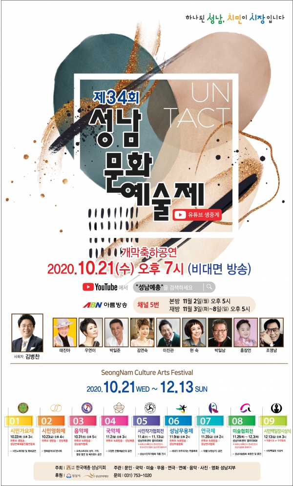 개최 날짜와 송출 채널은 ▲시민가요제 10월 22일 오후 3시. 성남연예예술인총연합회 유튜브 ▲시민영화제 ‘영화음악 OST 콘서트’ 10월 23일 오후 4시. 성남예총 유튜브 ▲음악제 10월 31일 오후 5시 성남음악협회 유튜브 ▲국악제 11월 2일 오후 3시. 성남예총 유튜브 ▲사진전 11월 4일~13일 성남아트센터 갤러리808(또는 한국사진작가협회 성남지부 홈페이지 온라인 전시) ▲무용제 11월 9일 오후 2시. 성남무용협회 유튜브 ▲연극제 ‘낙원상가’ 공연 11월 20일 오후 2시. 성남연극협회 유튜브 ▲미술전 11월 26일~12월 3일 성남아트센터 갤러리808(또는 성남미술협회 홈페이지 온라인 전시) ▲시민백일장 시상식 12월 13일 오후 3시 개별시상(또는 우편 발송) 등이다.이번 예술제는 준비 과정부터 행사 개최까지 모든 일정에 ‘코로나19 생활 속 거리두기 지침’을 철저히 준수해 진행한다.
