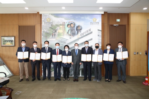 성남시의회(의장 윤창근)는 21일 오전 의장실에서 새롭게 의원연구단체 운영 심의위원회 위원을 구성하여 위촉하고, 5층에 있는 회의실로 자리를 옮겨 회의를 개최했다.