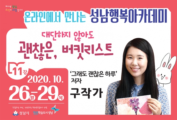 성남시는 성남행복아카데미 강연 열한 번째 이야기로 구작가(작가)를 초청 “대단하지 않아도 괜찮은 버킷리스트”라는 주제로 2020.10.26일 부터 10.29일 까지 4일간 유튜브 ‘성남TV’를 통해 시민들과 만나는 자리를 마련한다.