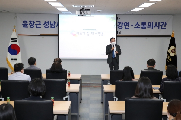 성남시의회 윤창근 의장은 22일 시의회 세미나실에서 의회사무국 직원을 대상으로 특강 및 소통의 시간을 가졌다.이날 의회사무국 직원 40여 명이 참석한 가운데 ‘포스트 코로나 시대에 대처하는 우리의 자세’라는 주제로 특강을 진행했다.