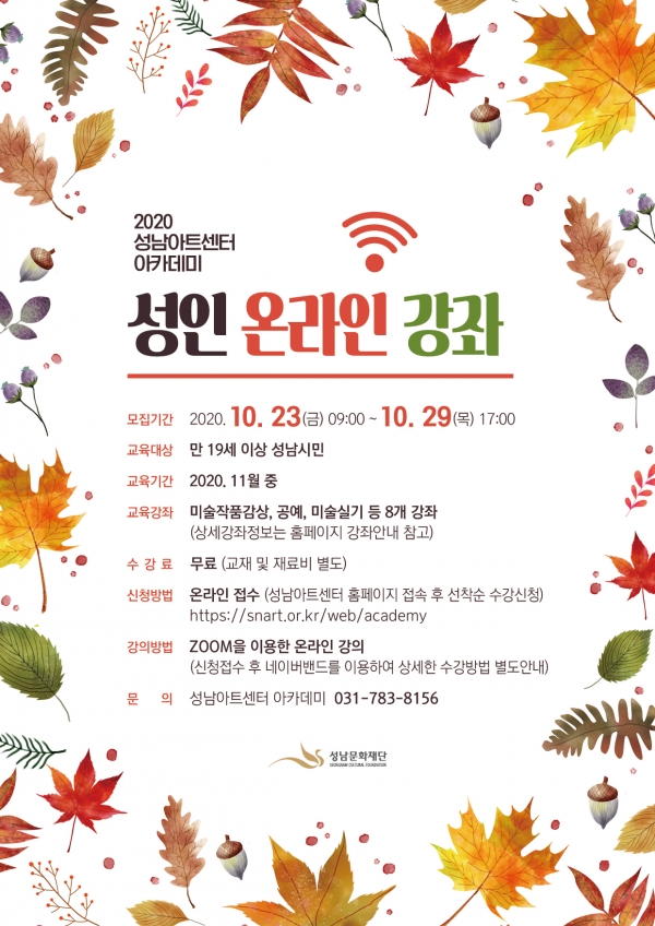 모든 강좌는 온라인 플랫폼 줌(ZOOM)을 통해 실시간 원격 수업으로 진행하며, 성남아트센터 홈페이지(www.snart.or.kr) 아카데미 수강신청 페이지에서 23일(금)부터 29일(목)까지 선착순으로 접수한다.기타 자세한 사항은 전화 031-783-8156(성남아트센터 아카데미)으로 문의하면 된다.