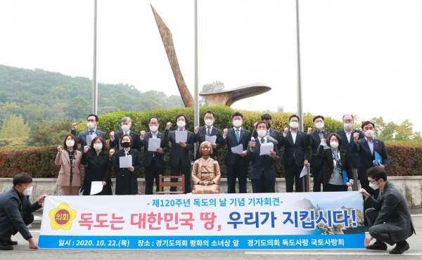 경기도의회 독도사랑·국토사랑회(회장 민경선 의원)는 22일 제120주년 독도의 날(10월 25일)을 기념하여 경기도의회 평화의 소녀상 앞에서 일본의 독도 침탈 야욕을 강력히 규탄하는 성명을 발표하였다.