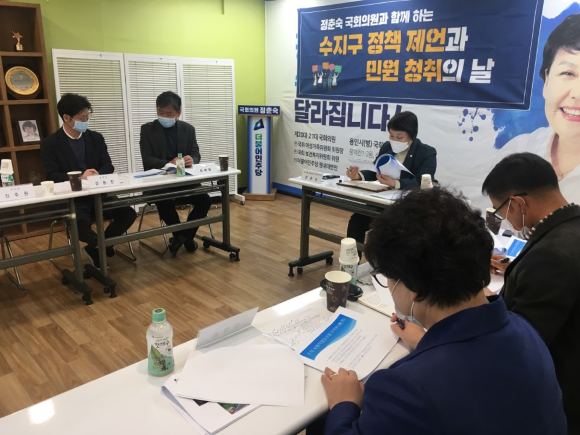 정춘숙 더불어민주당 의원(경기 용인시병)은 지난 24일 용인시 수지구 풍덕천 1동의 지역사무실에서 ‘정책제언과 민원청취의 날’을 개최했다. 코로나-19로 인한 사회적 거리두기 조치로 지난 7월 이후 3개월만에 진행되어 주민들의 관심이 매우 뜨거웠다.