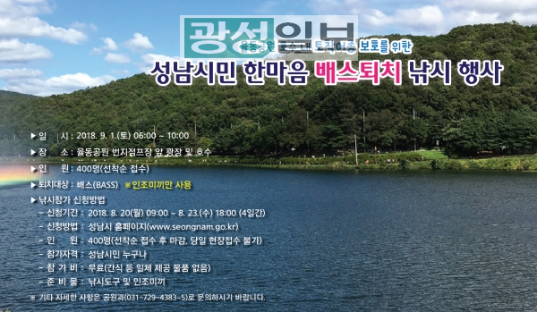 성남시는 오는 9월 1일 분당구 율동공원 호수에서 ‘성남시민 한마음 배스퇴치 낚시 행사’를 연다.
