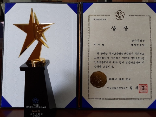 우리 전통 민속예술을 발굴, 육성, 전승하기 위하여 격년제로 개최되고 있는 ‘제13회 경기도 청소년민속예술제’에서 광지원농악이 우수상의 쾌거를 이루었다. 코로나19로 인해 비대면으로 개최된 이번 대회는 그동안 활동했던 사진 및 영상을 편집해 제출하는 방식이었다. 엄정한 영상 심사를 거쳐 지난 10월 23일 고양문화원 앞마당에서 시상식을 가졌다.