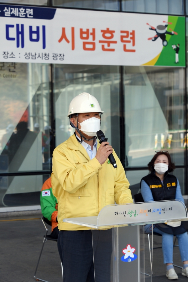 최근 다양한 목적으로 사용되는 드론으로 테러 상황을 가정해 테러범이 드론을 통해 성남시청 광장에 정체불명의 유독성 화학물질을 살포하면 시청 주변을 예찰하던 드론과 시민이 테러상황을 신고하고 이어서 인명대피, 노출자 구조, 현장제독 등 전 과정을 실제와 같이 훈련을 실시했다.